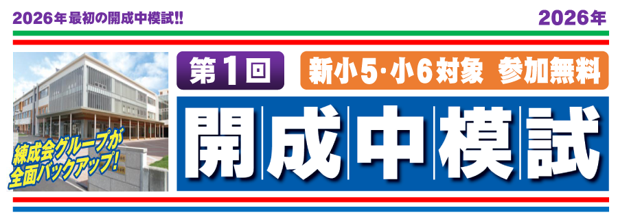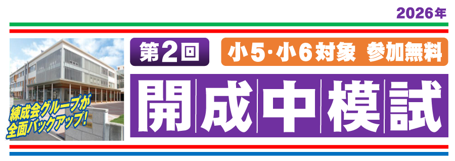 開成中模試(2026年) | 練成会グループ《公式》2025.12.212024.12.25受検上のお願い◆駐車場指定駐車場がありませんのでご注意ください。お車での送迎の際、会場周辺での路上駐車はご遠慮ください。◆開場時間会場準備の関係上、午前10:00から会場への入室が可能となります。開場まで1階にてお待ちください。◆答案・個人成績表の配付開成中模試の受検後、答案・個人成績表につきましては、練成会グループ塾生は通塾会場にて配布、一般の方は郵送となります。精度の高い合格判定を行うため、受検から約2週間後の返却・配布となります。お申し込みはこちら